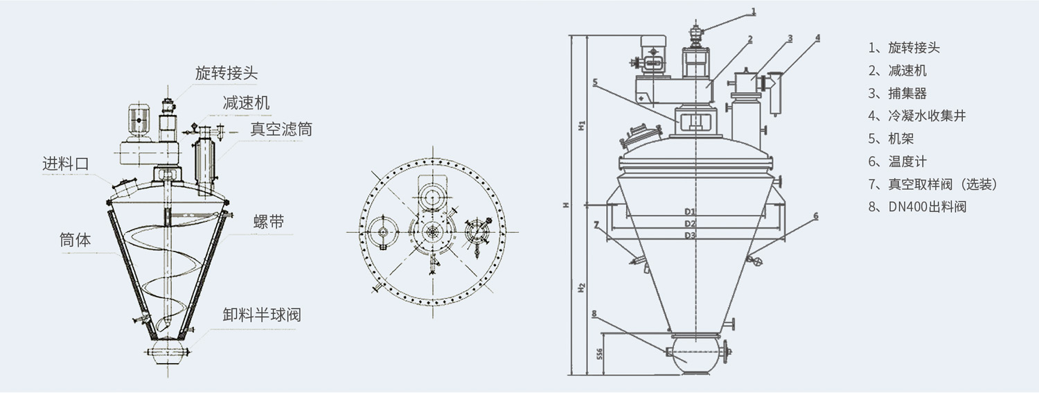 单锥螺带真空干燥机可以同时替代混合与干燥设备(如:双锥干燥机、耙式干燥机、双锥混合机和双螺杆混合机等)在同一台设备内完成混合、干燥、卸料全过程。也可进行冷却、杀菌、反应等操作。能广泛应用于医药,化工,农药,食品等行业。是混合、干燥的理想设备,可实现全封闭,全过程的连续操作生产。